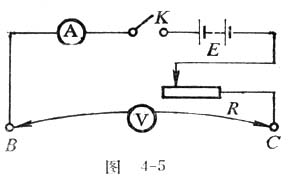 (1)演示导体的电阻与材料有关。把安培计、开关、电源和滑动变阻器R串联成图4-5所示的电路。分别把图4-4中的导线ab和a′b′连接到图4-5中的B、C间,并将伏特计并接在ab和a′b′上,调节滑动变阻器,使B、C间电压保持3伏,分别由安培计读出电路中的电流值。由测出的电流得出:长度和横截面积相同的康铜线和镍铬线,康铜线的电阻较小,镍铬线的电阻较大。说明导体的电阻与材料有关。